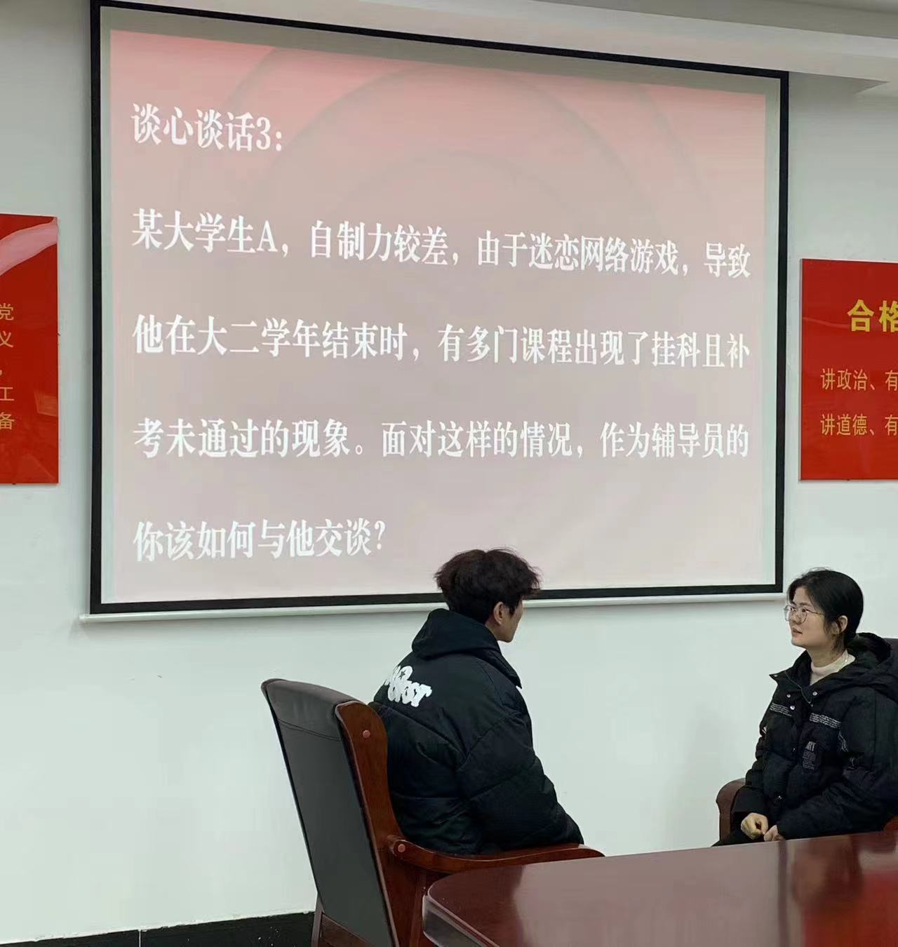 谈心谈话环节主要考察辅导员对学生特征、学生成长规律的了解把握程度及对学生的教育引领能力、解决理论困惑和实际问题的能力,此次谈心谈话环节结合辅导员的日常工作内容,从学生思想理论教育和价值引领、大学生心理健康教育、职业规划与就业创业指导等方面还原现实谈话场景。
