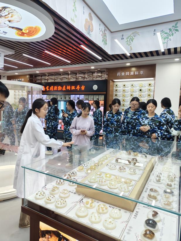 从中医药文化长廊开始,开启本次中医药文化启蒙之路。首先由老师带领大家系统介绍了中药科技馆的建设背景与整体布局。随后各展厅讲解员带领新生依次参观中医药文化厅、浸制与腊叶标本厅、VR/AR互动体验区和药食同源展示厅等。在中医药文化厅,同学们借助图文展板与实物展陈,了解了中医药从古至今的发展脉络;在浸制与腊叶标本厅,讲解员结合实例讲解了标本制作工艺与药用价值;在药食同源展示厅,同学们“怀山药、熟地黄、怀菊花”等实物标本,感受我国药食同源文化的独特性;最受关注的VR/AR互动区,戴上设备即可“置身”山区,跟随指引完成辨药、采药操作,科技感十足的体验让传统知识“活”了起来。