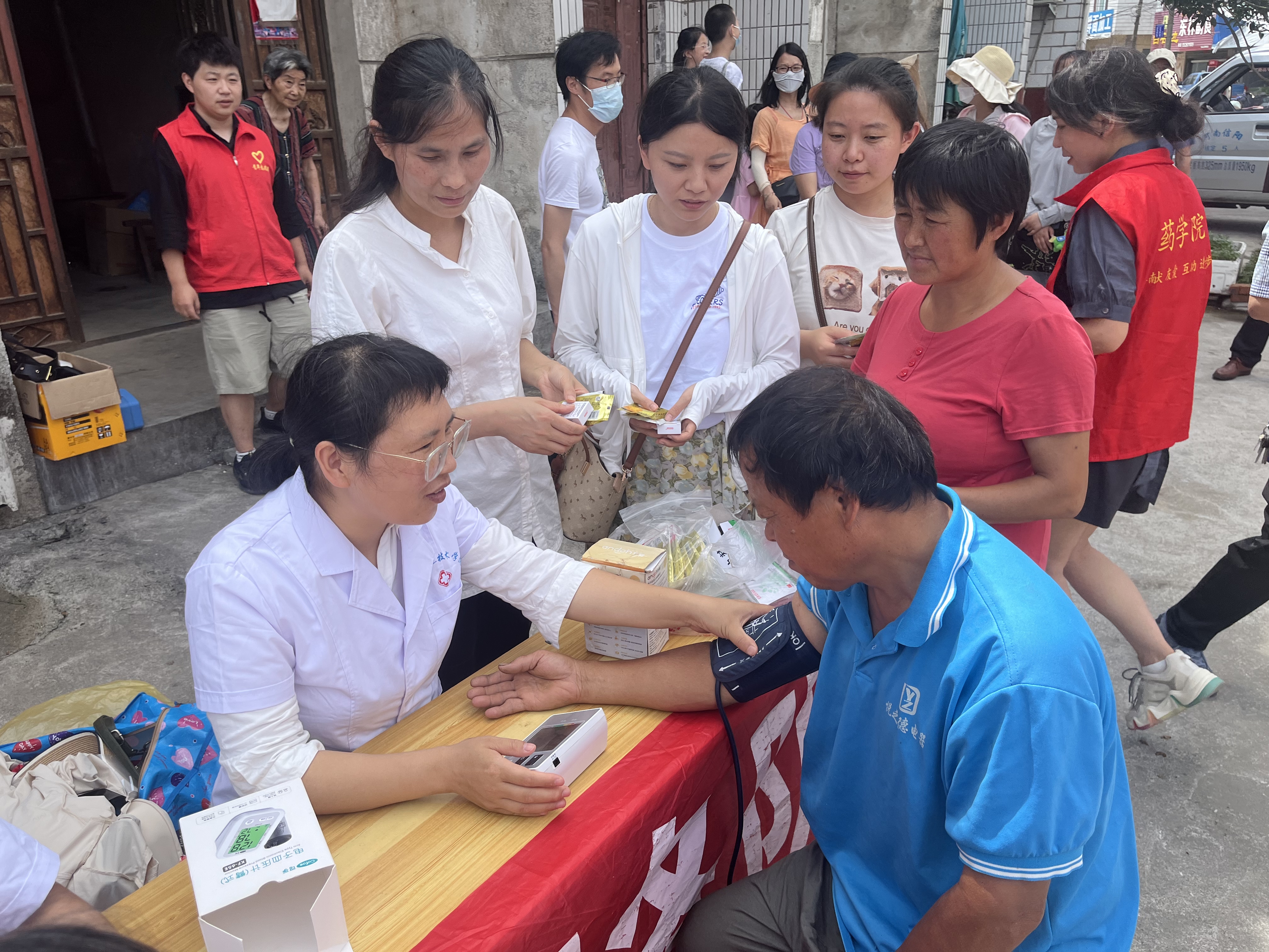 教师党员们热情耐心地为前来体检的居民量血压、号脉搏,详细询问他们平时身体健康状况,有无在家服药史;认真指导如何应对血压高、血糖高等问题;发放一些消暑降温的药物和用品。