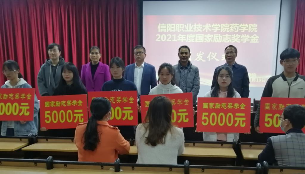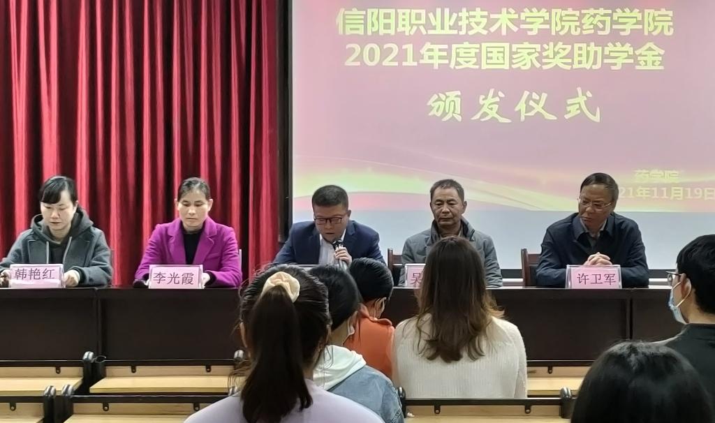 副书记李光霞宣读了2021年度国家奖助学金获奖学生名单。随后,beat365英国官网网站领导老师对获得奖助学金的学生代表进行了颁奖并合影留念。接着,国家励志奖学金获得者20级普专药学一班简新瑶和国家助学金获得者21级普专药学五班黄明含分别作为获奖学生代表依次上台发言。他们在发言中一致表达了对国家资助政策的感恩,表示要继续努力学习,掌握专业知识,以优异的成绩为学校争光添彩,做一个有理想、有抱负、有志向的新时代大学生,为建设祖国奉献自己的力量。