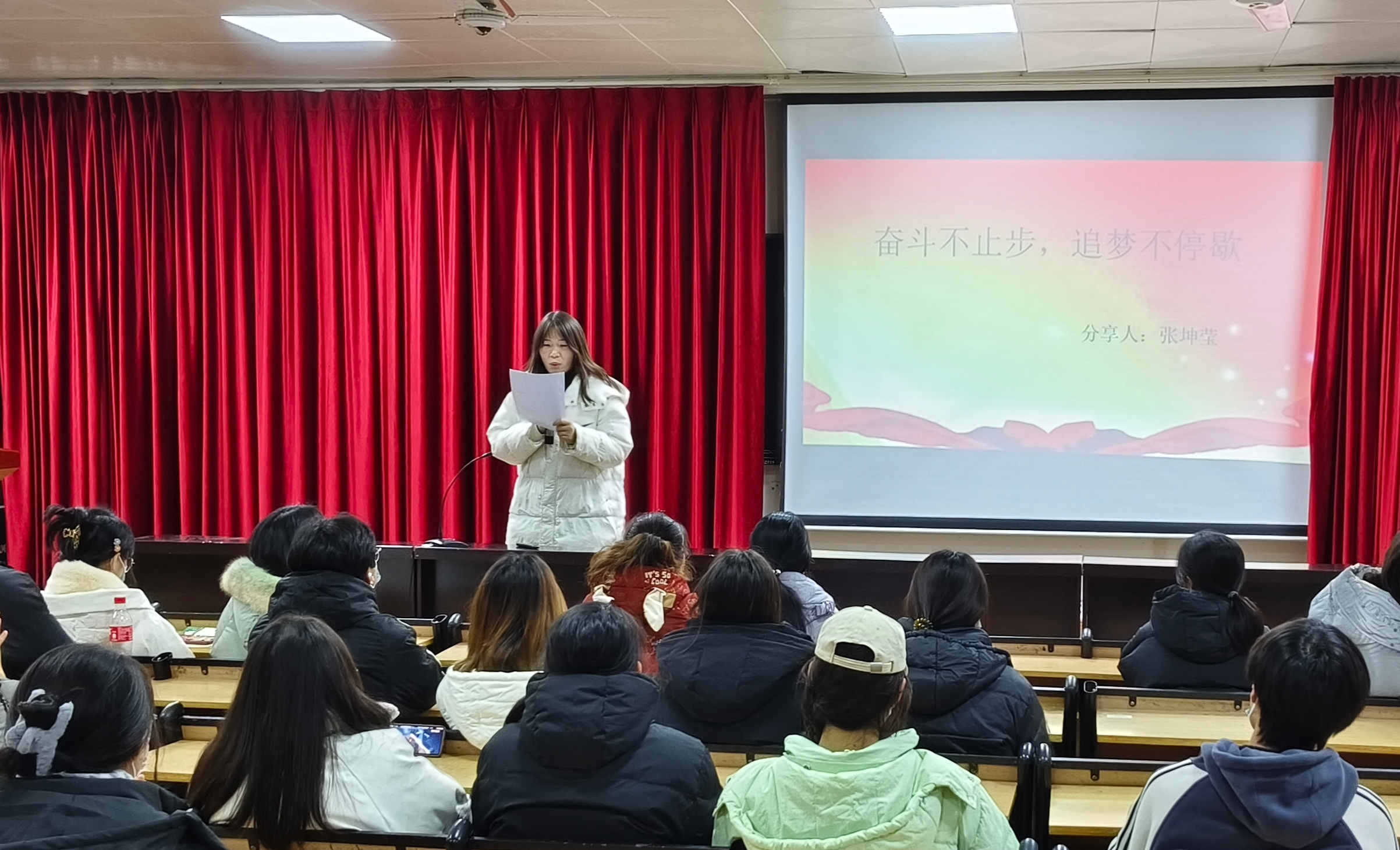 最后,由学工党支部张坤莹同学上台发言。作为国家奖学金获得者,她认为作为一名学生党员,只有以学习为基础,刻苦磨炼技能,才能在日后的工作生活中行稳致远。